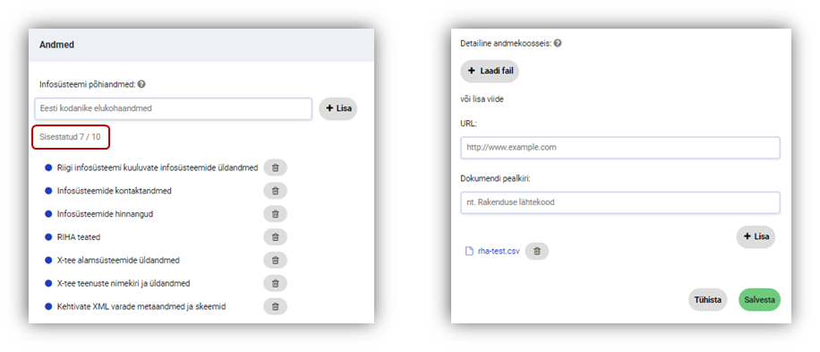 - Veerus Infosüsteem märgitakse lisaandmetel (kui PA on märgitud "ei") selle infosüsteemi nimi (RIHAs esitatud kujul), mille andmeid kirjeldatav andmeobjekt kasutab.