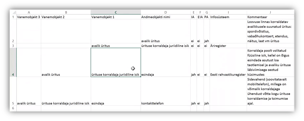 - Veergudes IA (isikuandmed), EIA (eriliigilised isikuandmed) ning PA (põhiandmed) tohib kasutada väärtusi „jah“ või „ei“.