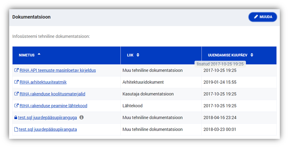 Nii veebilinkide kui ka failide puhul saab lisamisel märkida ka dokumendi liigi: arhitektuuridokument, andmekaitsealane mõjuhinnang, viide avaandmetele, kasutatav klassifikaator jne. Nii saab dokumentatsiooniga tutvuja või hindaja kiire esmase ülevaate lisatud dokumentatsiooni olemusest. Peatudes hiirega dokumendi või veebiviite uuendamise kuupäeval, kuvatakse ka vastava objekti lisamise kuupäev (kui see erineb muutmise kuupäevast).