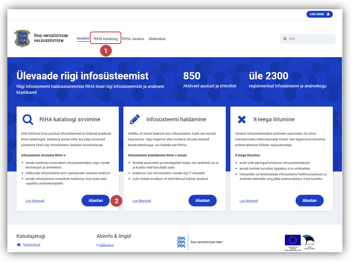 2 | kasutajaliidese avalehelt RIHA kataloogi sirvimise plokist nupp Alustan. |