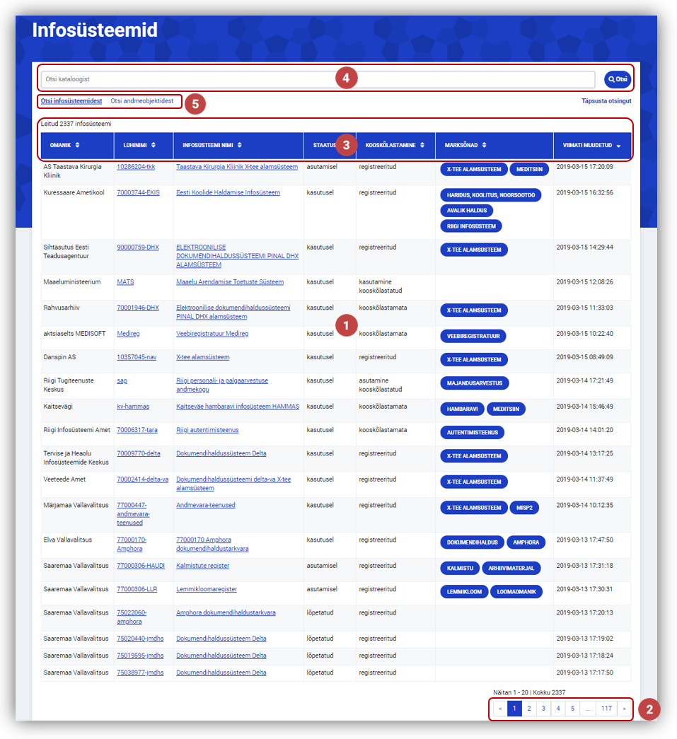 2 | Korraga näidatakse ühel lehel kuni 20 kirjet, kui aga tulemusi on rohkem, siis saab nimekirja lõpus oleva numeratsiooni abil liikuda järgmistele või eelmistele lehekülgedele. |
