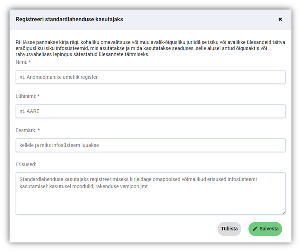 Pärast sisestatud andmete salvestamist luuakse uue infosüsteemi kirjeldus, kuhu lisaks juba sisestatud andmetele kopeeritakse osa andmeid ja dokumente kasutatava standardlahenduse kirjeldusest.