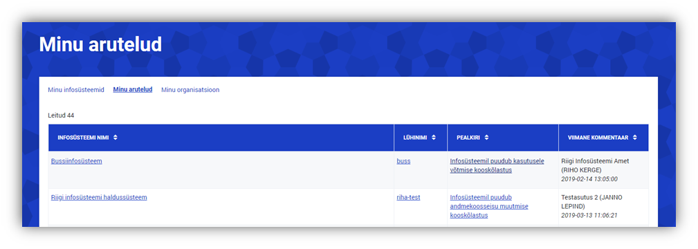 Minu arutelud alajaotuses kuvatakse kasutajaga seotud asutuse infosüsteemide aktiivsed arutelud koos arutelu pealkirja, viimase kommentaari lisaja ning lisamise ajaga. Klõpsates infosüsteemi nimel või lühinimel, kuvatakse vastava infosüsteemi hindajate tagasiside blokk, klõpsates arutelu pealkirjal kuvatakse vastav arutelu koos võimalusega uue kommentaari sisestamiseks.