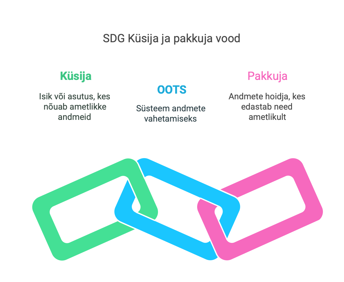 SDG toimimine hõlmab kahte peamist osapoolt: küsijat (requester) ja pakkujat (provider), kes suhtlevad Once-Only Technical Systemi (OOTS)⬇️ kaudu ametlike andmete ja dokumentide vahetamiseks.