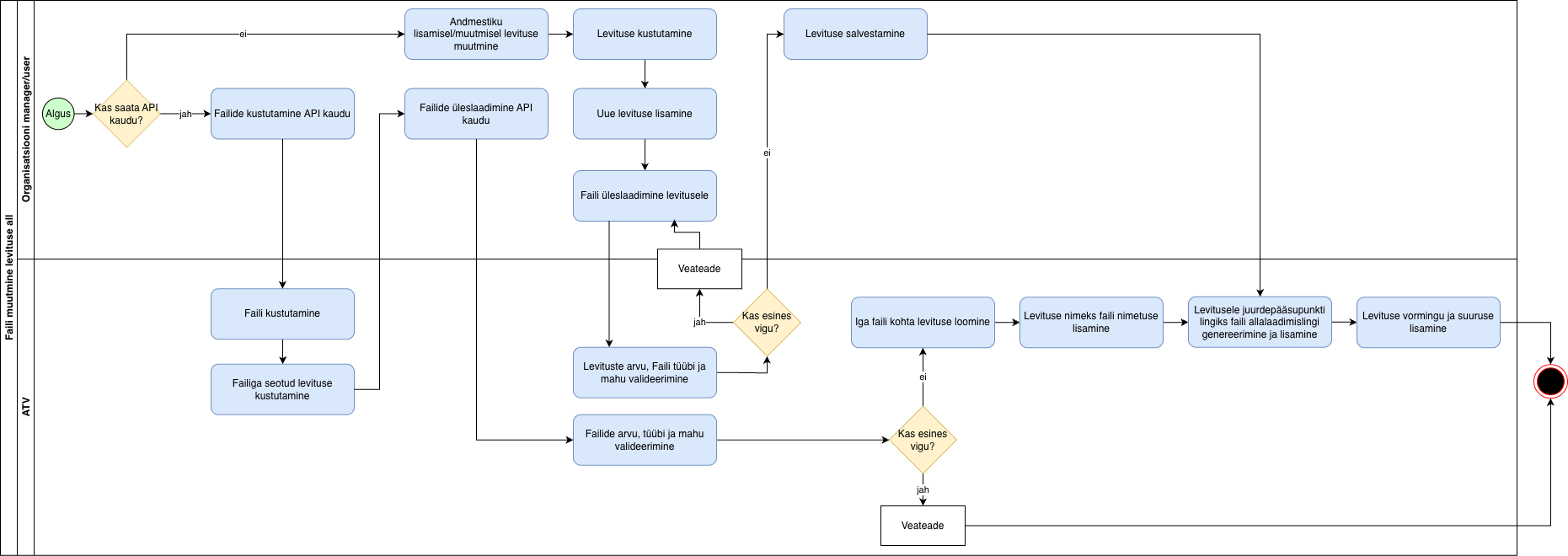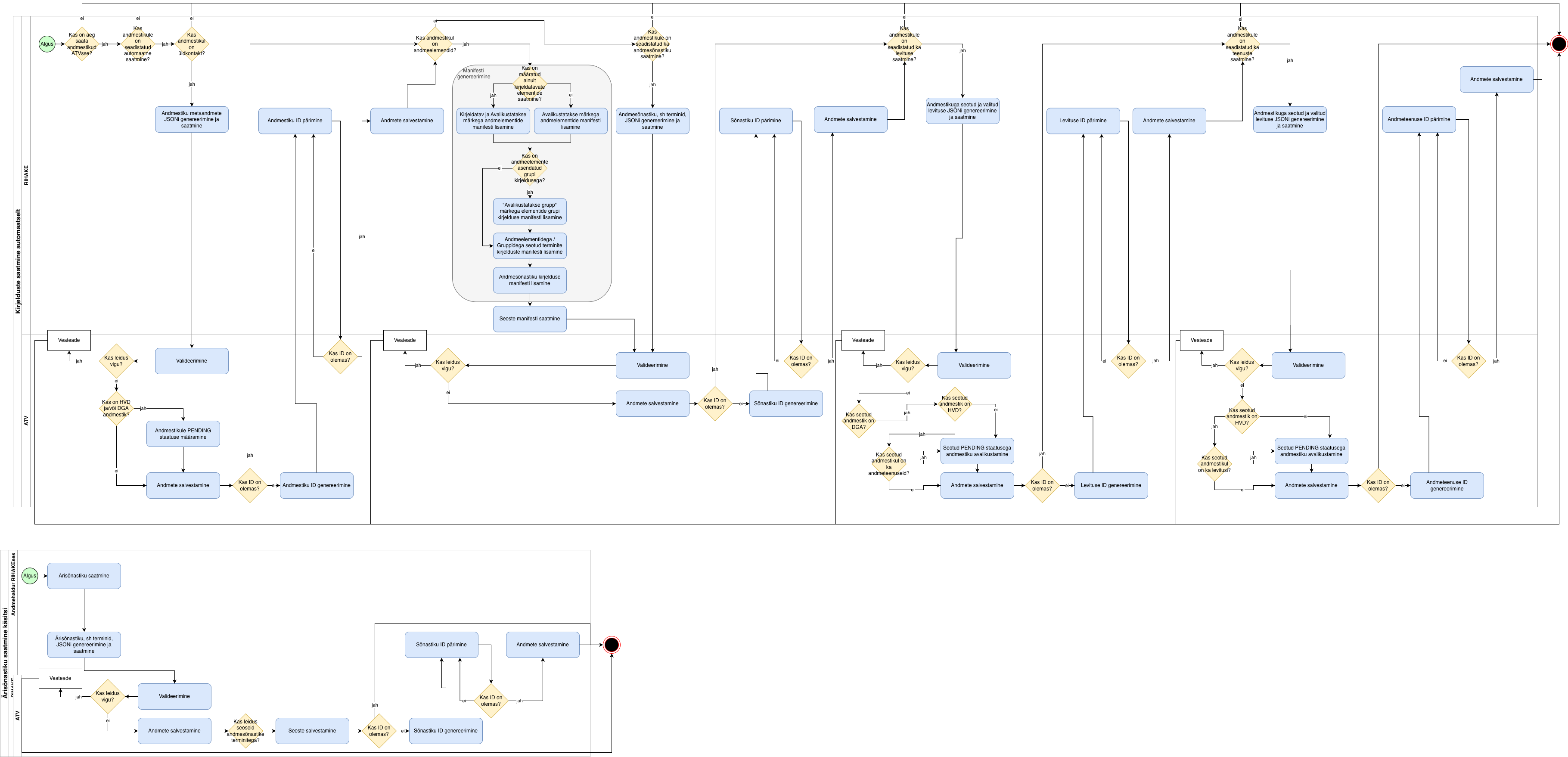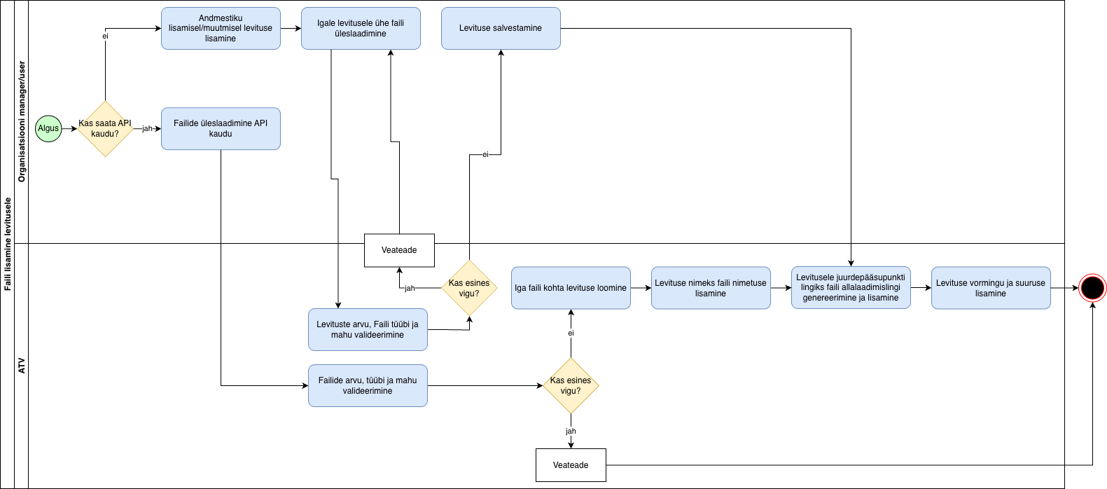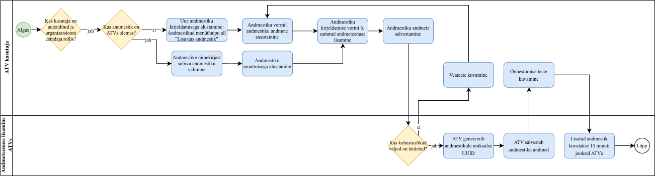 Andmeteenust on võimalik lisada nii läbi kasutajaliidese kui MJ API. Protsessijoonisel on kirjeldatud andmestiku lisamist läbi kasutajaliidese. Andmeteenuse lisamiseks läbi kasutajaliidese on kasutajal kaks valikut - teha seda koos andmestiku lisamisega või lisada andmeteenus juba ATVs kirjeldatud andmestikule.