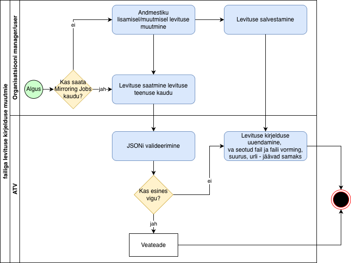 Andmestik on võimalik lisada ja muuta läbi nii kasutajaliidese kui Mirroring Jobs (MJ) API. Protsessijoonisel on kirjeldatud andmestiku lisamist läbi kasutajaliidese. Andmestiku muutmine toimub sama põhimõtte alusel - läbi andmestiku vormi.