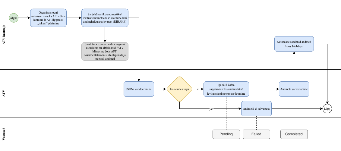 Andmestiku sarja, sõnastiku, andmestiku, levituse või andmeteenuse lisamine on võimalik vaid läbi MJ API. API kaudu edastamiseks on toetav juhend: Mirroring Jobs API V2 dokumentatsioon.