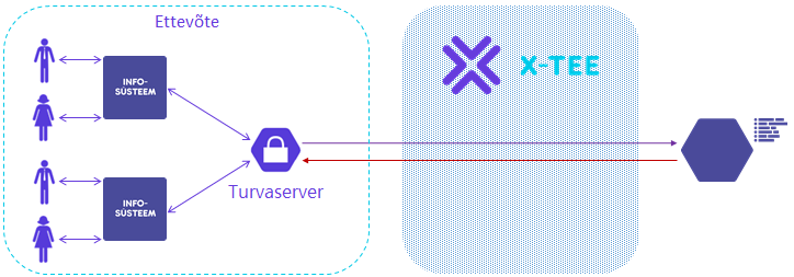 Joonis 3.1 Lihtliikmesus. Skeemil on kaks ettevõte infosüsteemi, mis kasutavad X-teega suhtlemiseks ühist turvaserverit. Turvaserver ise on samuti ettevõtte enda kontrolli all.