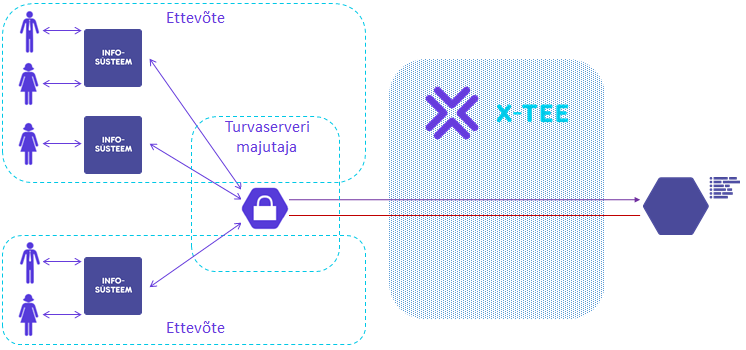 Joonis 3.2 Majutatud turvaserver. Skeemil on kaks ettevõtet, ühel neist on üks ja teisel kaks infosüsteemi. Mõlemad ettevõtted kasutavad oma infosüsteemide jaoks sama turvaserveri majutaja teenust ja turvaserveri majutaja kasutab sama turvaserverit mõlema ettevõtte infosüsteemide jaoks.