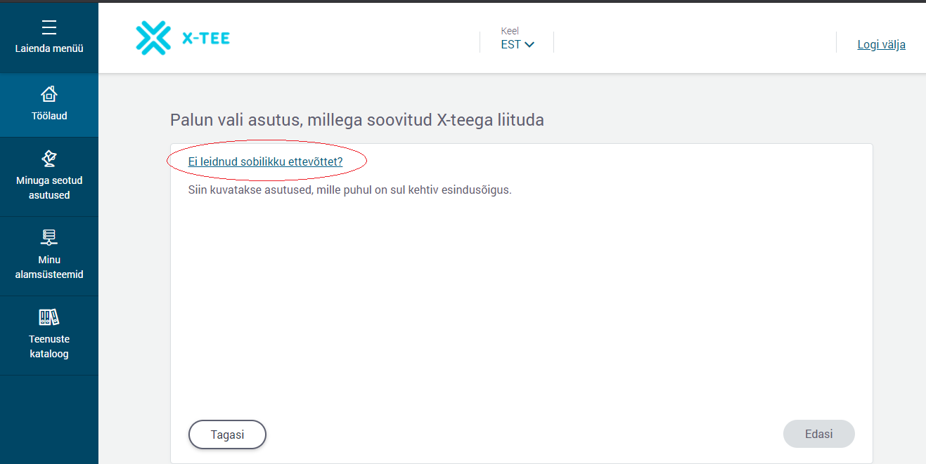 Kui olete sisse loginud ning soovite enda asutuse nimel X-teega liituda või selle asutuse informatsiooni X-tee iseteeninduskeskkonnas hallata, aga märkate, et ei leia enda asutust "X-teega liitumine" või "Minuga seotud asutused vaates, siis tuleb teid esmalt volitada selle asutuse esindajaks.