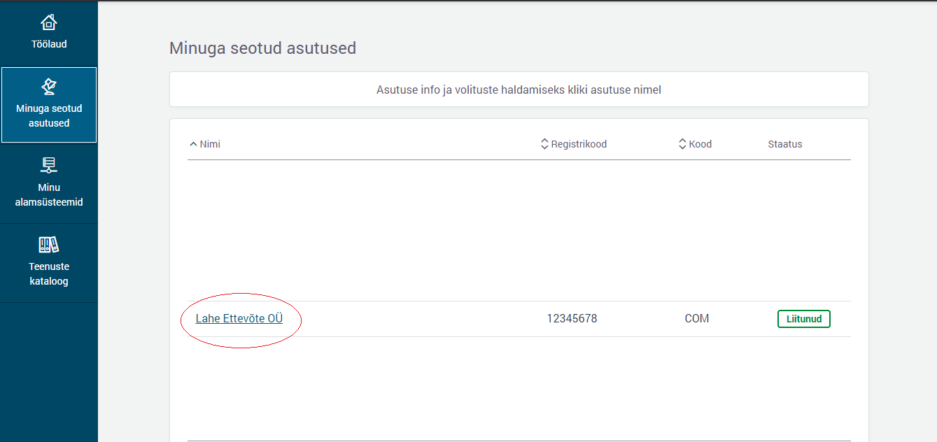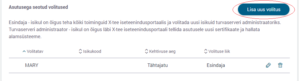 Kui Teie asutus on juba X-teega liitunud ning Teil endal on olemas kehtiv volitus seda asutust X-tee iseteeninduskeskkonnas hallata, aga soovite selleks veel kedagi volitada, siis saate seda teha "Minuga seotud asutused" vaates: