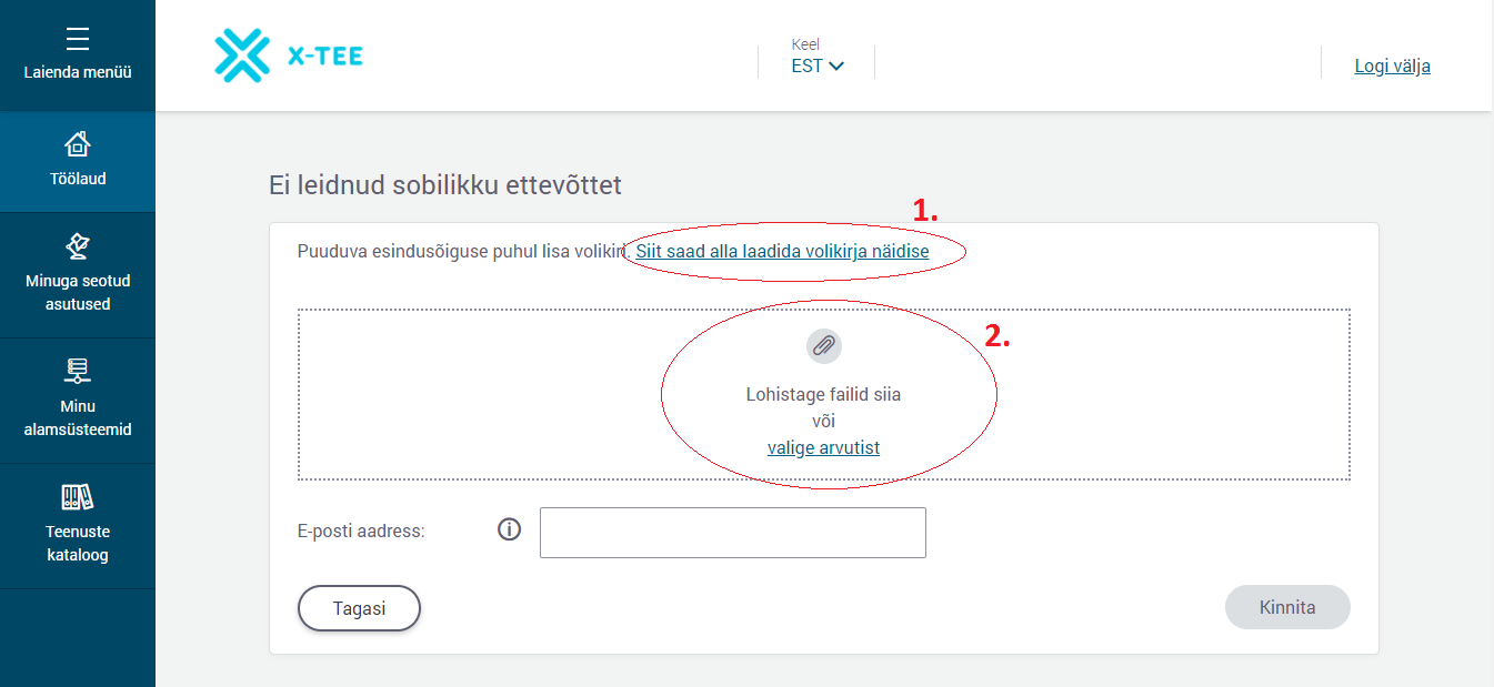 NB: Täidetud volikiri peab olema digitaalselt allkirjastatud asutuse esindusõigusliku isiku poolt!Ülesse laadida täidetud ja digitaalselt allkirjastatud volikirja. See edastab Teie volikirja meile ning me saame selle alusel anda vastavad õigused volitatud isikule.